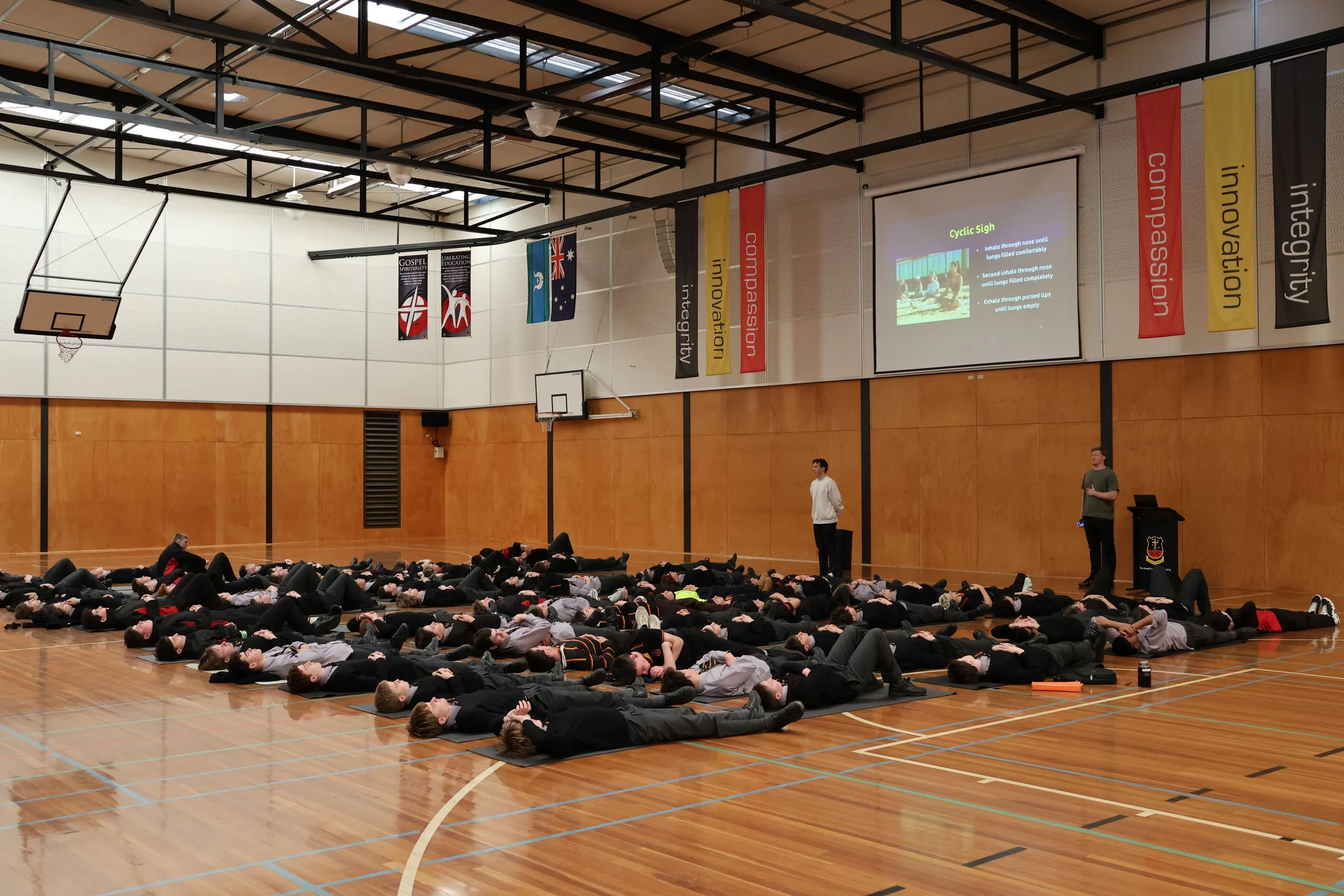 “This immersive presentation by James Hartson and Charlie Furphy was amazing! 180 Yr 11’s were taught the power of the breath. Uplift provided tangible tools for managing stress, enhancing focus, and nurturing well-being with a full presentation on scientifically proven Breathwork techniques. Highly recommend.”
